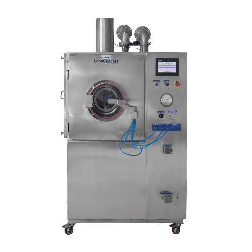 The coating material is applied to a continuously moving bed of tablets, and a system ensures the swift removal of the solvent through a hot air current. The product to be coated is placed in a closed drum that undergoes continuous orbital motion, and the coating system evenly sprays the coating material in a rotating motion to prevent excess deposition on the tablets.